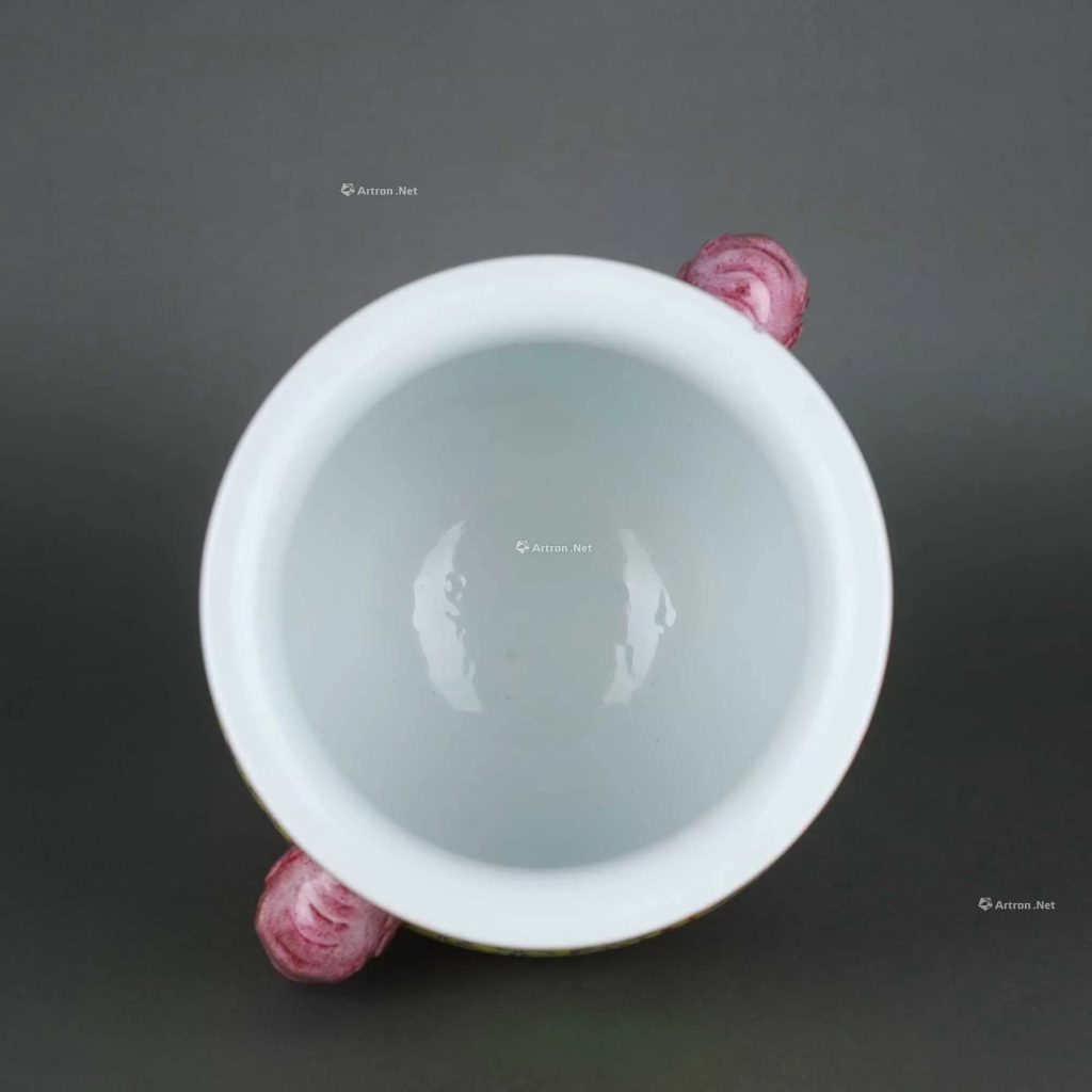 - 清乾隆黃地洋彩纏枝蓮托八寶紋立耳香爐