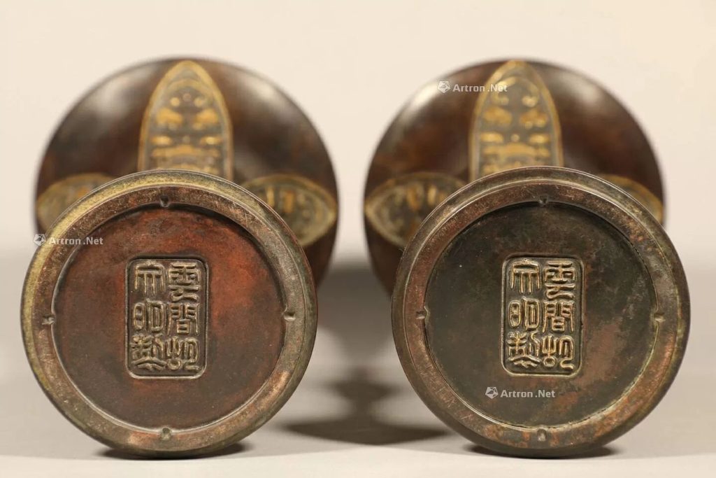 - 成對製作的特殊性明清銅器中,成對器物多見於禮器或高級陳設品,需嚴格對稱設計與統一工藝。此對花觚尺寸、紋飾、鎏金部位完全一致,獸面紋的眉眼、鬃毛等細節亦精準對稱,體現胡文明工坊高超的協調能力。據考證,胡文明製器「誓不傳外人」,其作品多由家族成員協作完成,成對花觚可能為特定訂製,彌足珍貴。
