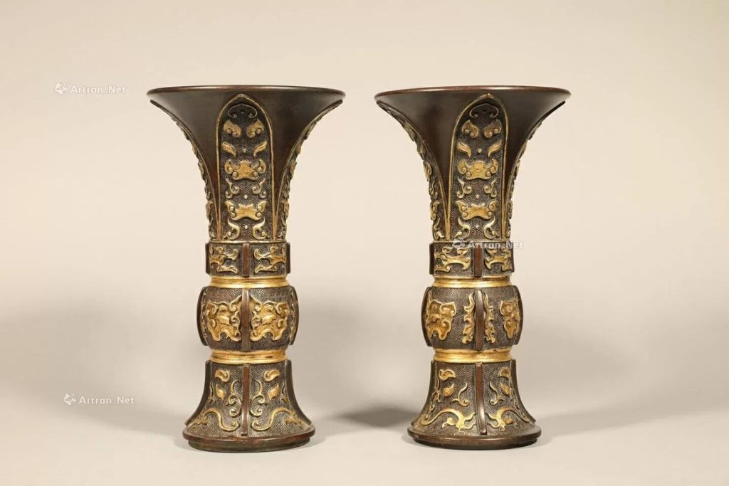 - 造型與紋飾花觚整體呈喇叭口、細腰、高圈足的經典形制,通體分為頸、腹、足三部分。頸部飾以蕉葉紋與雲雷紋,腹部浮雕獸面紋(饕餮紋),雙目圓睜、鼻梁高聳,襯以珍珠地紋,獸面兩側對稱分佈夔龍紋;足部外撇,飾以變形蓮瓣紋。四條鎏金出戟從頸部延伸至足部,增強立體感與視覺張力。