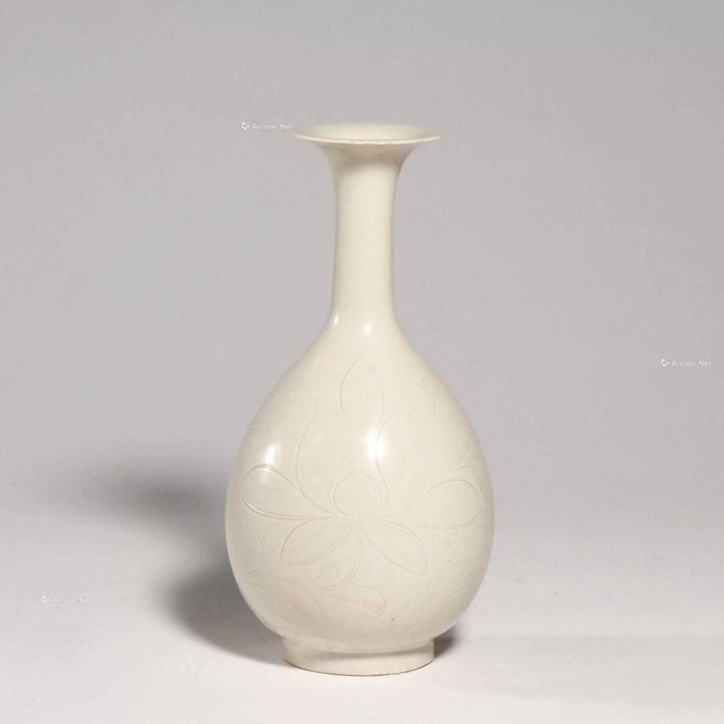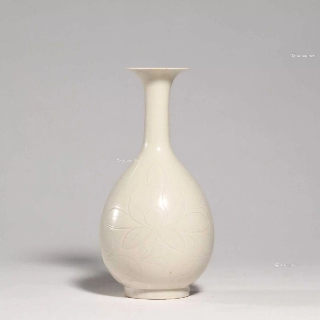 宋代定窯白釉刻花紋瓶以其挺拔秀美的造型和精湛細膩的刻花工藝著稱,典型器型包括梅瓶、葫蘆瓶、直頸瓶等。例如故宮博物院藏定窯白釉刻花花卉紋梅瓶(高 37.1 厘米),小口折沿,短頸豐肩,腹部刻纏枝蓮紋,脛部飾蕉葉紋,線條流暢,層次分明,體現了宋代「以簡為美」的審美情趣。這類瓶器多為宮廷或貴族陳設用器,兼具實用與禮器功能,部分器型(如葫蘆瓶)還蘊含「福祿雙全」的吉祥寓意。