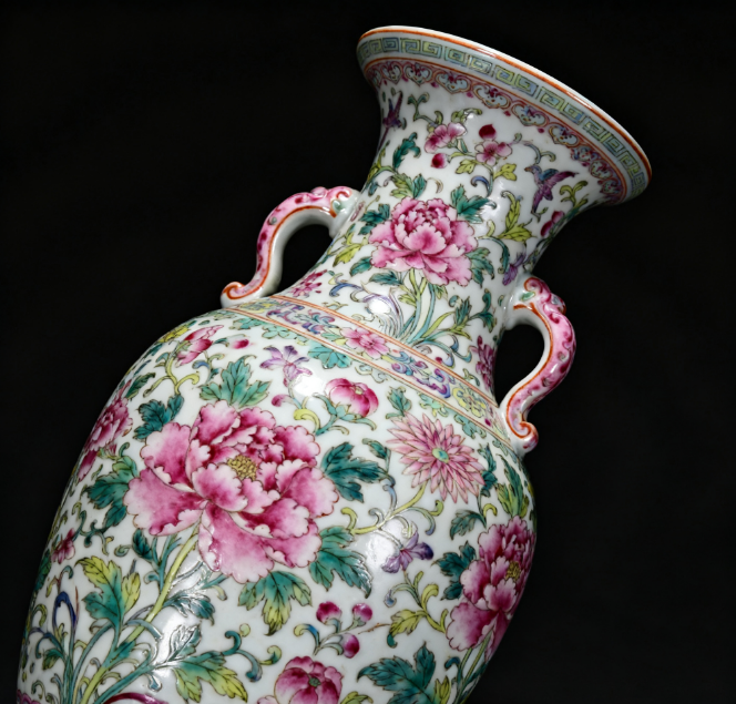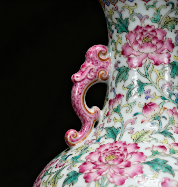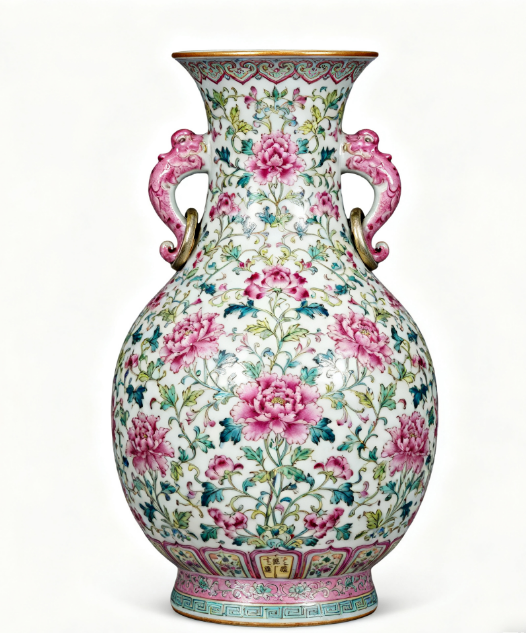 一、造型特徵 瓶口向外撇開,頸部收束(束頸),頸部兩側裝飾有粉色如意形耳,線條優美流暢;腹部渾圓飽滿,底部圈足規整勻稱,整體造型端莊大氣,兼具穩重感與審美韻味。