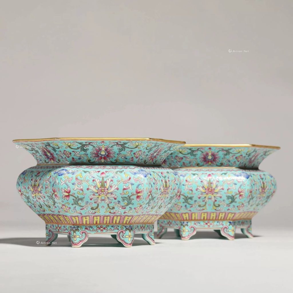 - 主紋纏枝花卉:以粉彩繪製纏枝蓮、牡丹等花卉,枝莖纏繞盤曲,花朵層疊盛開,葉片翻卷自如,構圖繁而不亂。例如,香港佳士得 2022 年拍品「嘉慶粉彩纏枝蓮托壽字紋花盆」,每面繪纏枝蓮拱托描金「壽」字,寓意「長壽富貴」,紋飾布局嚴謹,線條流暢細膩。