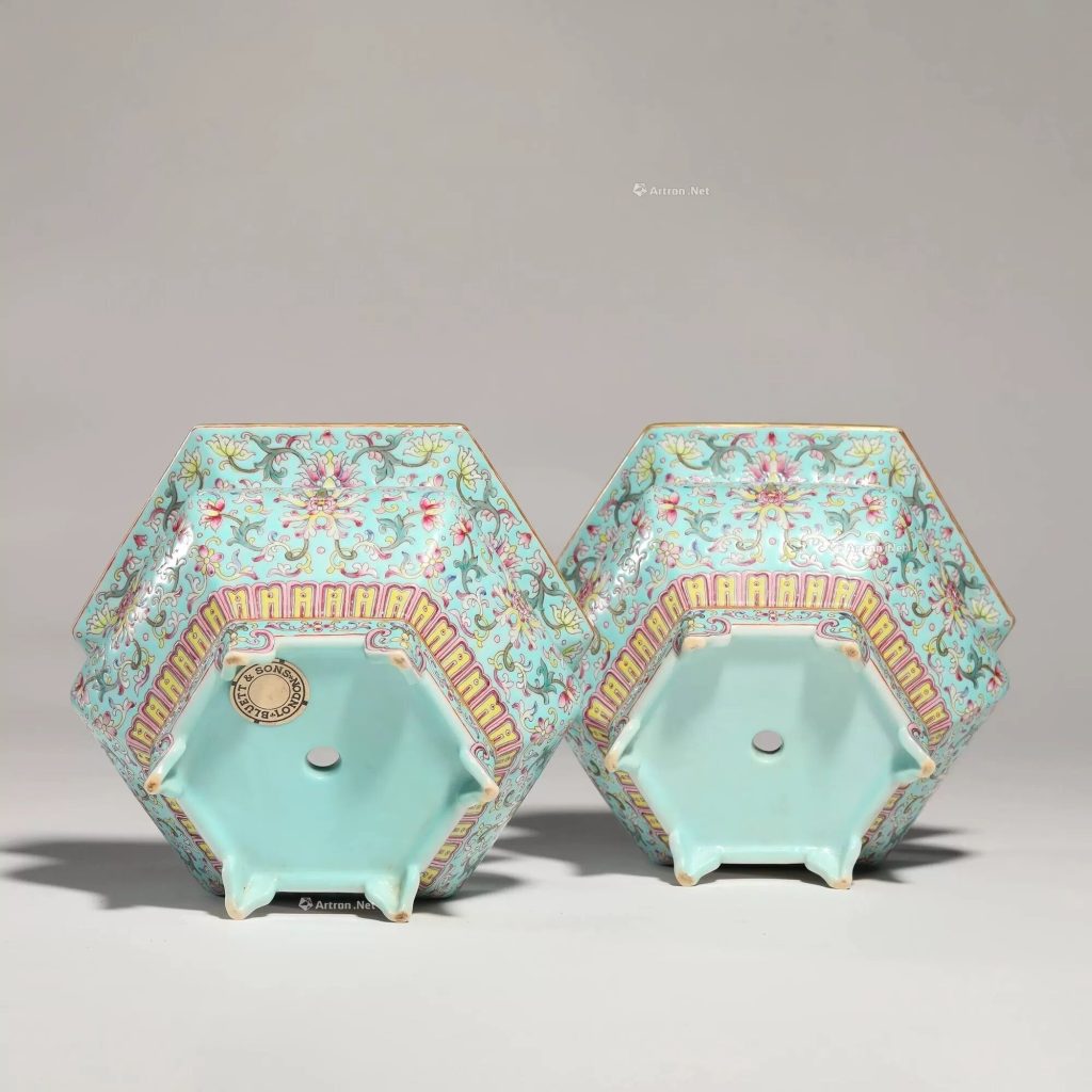 嘉慶朝處於清代由盛轉衰的過渡期,瓷業生產延續乾隆舊制,但整體工藝水準有所下降。粉彩作為嘉慶彩瓷主流,風格從乾隆的華麗繁縟轉向簡約雋永,纏枝花卉紋成為園林陳設器的典型裝飾題材,既體現宮廷審美,亦反映文人雅趣。此類六角花盆存世量較少,多見於博物館收藏(如台北故宮博物院藏「嘉慶粉彩花卉紋花盆」),拍賣市場中完整成對者尤為珍罕,歷年成交記錄集中在 10-15 萬元人民幣區間,高品質官窯器偶爾突破 20 萬元。