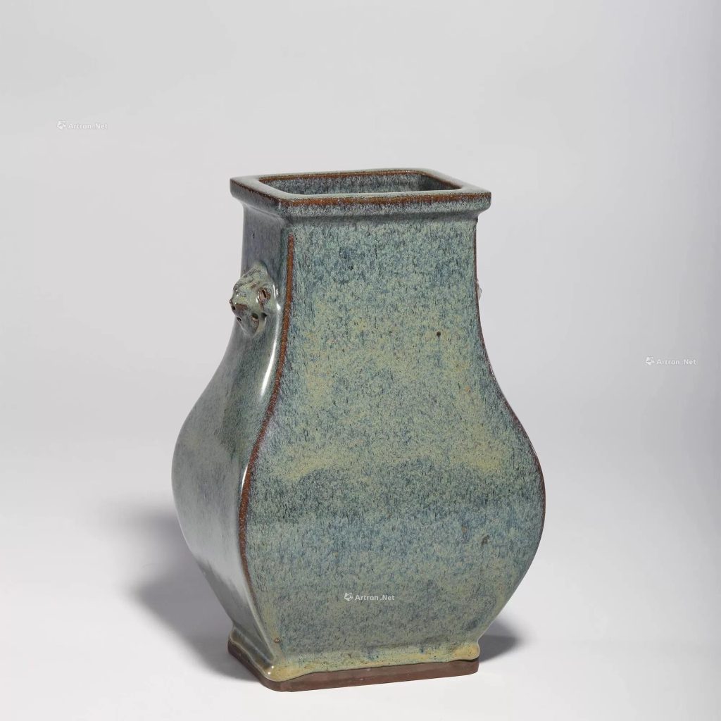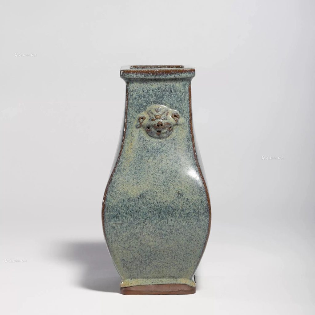 清 海鼠釉紫砂胎獅耳花瓶是清代宜興窯仿鈞釉陶器中的精品,融合了紫砂胎的細膩質地與獨特釉色工藝,具有較高的藝術價值與歷史意義。以下從器物特徵、工藝細節及拍賣紀錄三方面展開分析: