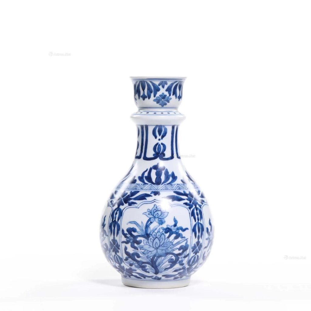 - 1998年伦敦多禄溙拍賣會清康熙青花纏枝團花紋長頸瓶一對,高 19.4 公分,成交價 6,000-88,000 美元。該拍品器型修長,紋飾精美,體現了康熙青花的國際認可度。