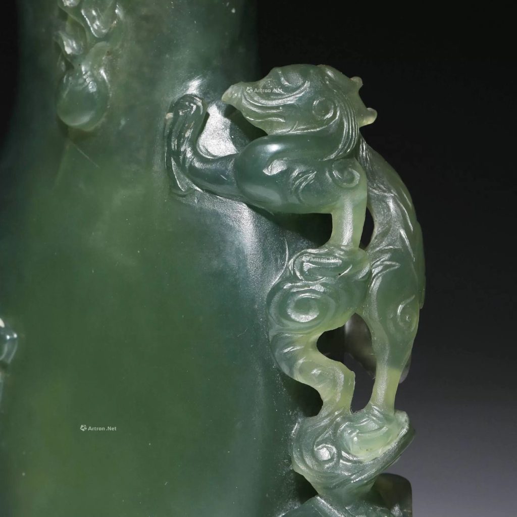 清代乾隆時期是玉器工藝的鼎盛階段,宮廷造辦處玉作在吸收歷代技藝的基礎上,開創了「乾隆工」風格。碧玉龍鳳耳蓋瓶的設計融合了青銅器的莊重與玉器的靈秀,其連體器造型可能受西亞金銀器影響,同時融入中國傳統吉祥文化,成為乾隆朝玉器創新的代表之一。此類器物多由新疆和闐碧玉製成,玉料透過「玉石之路」進貢宮廷,經造辦處工匠耗時數年雕琢而成,工藝成本極高。