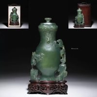 - 拍品详情:高 25 厘米,盖面镂空缠枝莲纹,鎏金狮钮,腹部八宝纹排列对称,釉色鲜艳。