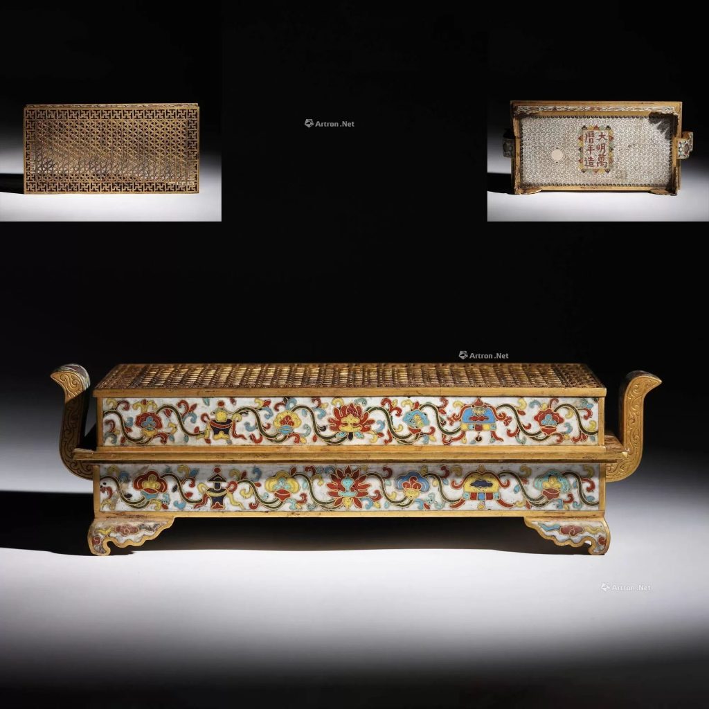 - 拍品详情:高 23 厘米,方体,鼓腹,四足外撇,盖面镂空缠枝莲纹,底刻 “大明万历年制” 款。釉色鲜艳,鎏金完整。