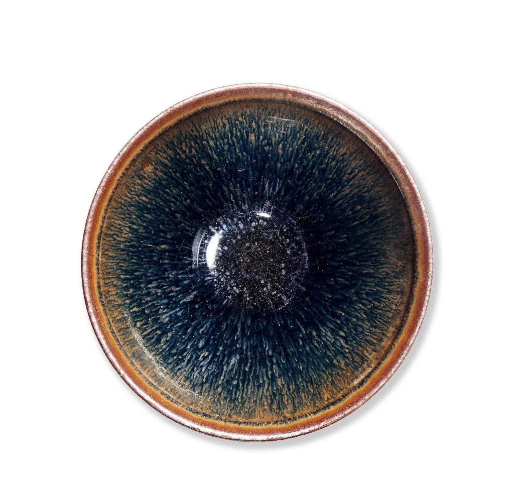 建盞的興起與宋代鬥茶風氣密切相關。鬥茶以「湯花鮮白、咬盞持久」為勝,黑釉能襯托茶沫顏色,而兔毫紋因毫毛狀結晶懸浮於釉中,猶如「銀河傾瀉」,成為鬥茶者的首選。建窯工匠以當地特有的高鐵黏土(鐵含量 7%-10%)為胎,草木灰與鐵礦石配釉,在 1300℃以上的還原焰中燒造,創造出「入窯一色,出窯萬彩」的窯變奇蹟。