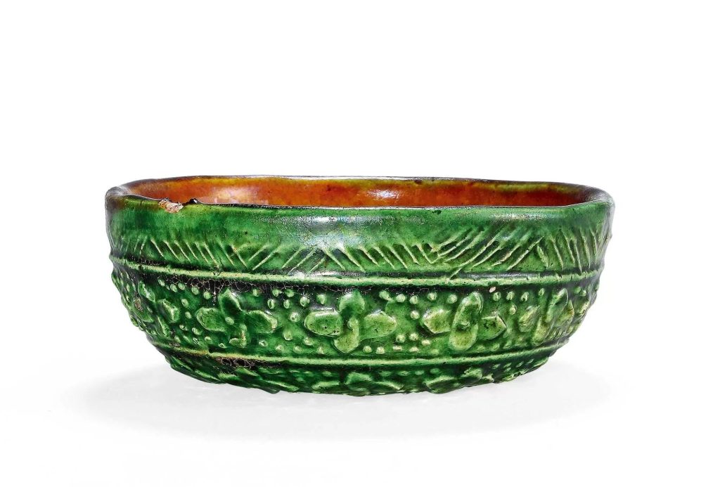 - 拍品详情:直径 18 厘米,盘心模印宝相花,内壁刻划莲瓣纹,施绿釉间以黄彩。胎质细腻,釉面有轻微土沁。