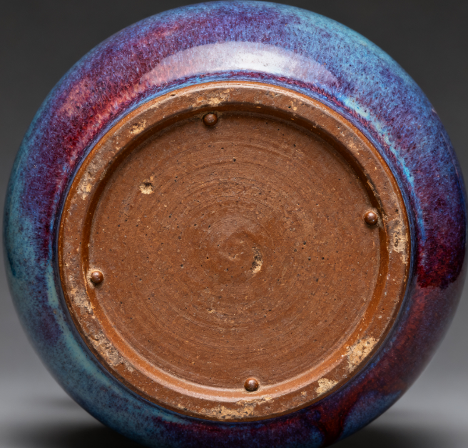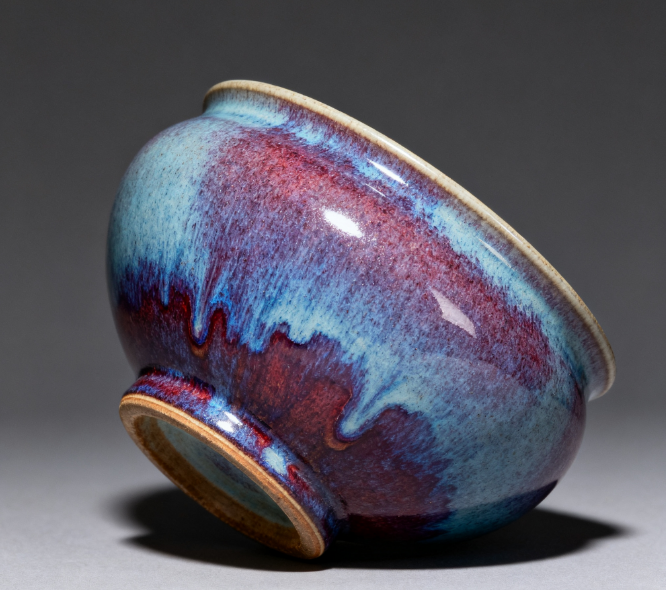 鈞窯窯址位於今河南禹州(宋代屬鈞州,故名「鈞窯」),分為官鈞與民鈞兩類。宋代鈞窯盞多為民間窯口燒制(官鈞以大型陳設器為主),燒造採用「二次燒成法」:先以高嶺土等原料製成胎體,經低溫素燒定型;再施釉入窯,以高溫(約 1250 – 1300℃)還原焰燒制,釉料中的銅、鐵等金屬元素在窯火中發生化學反應,形成變幻莫測的窯變效果,這也是鈞窯區別於其他宋代名窯的核心特徵 。