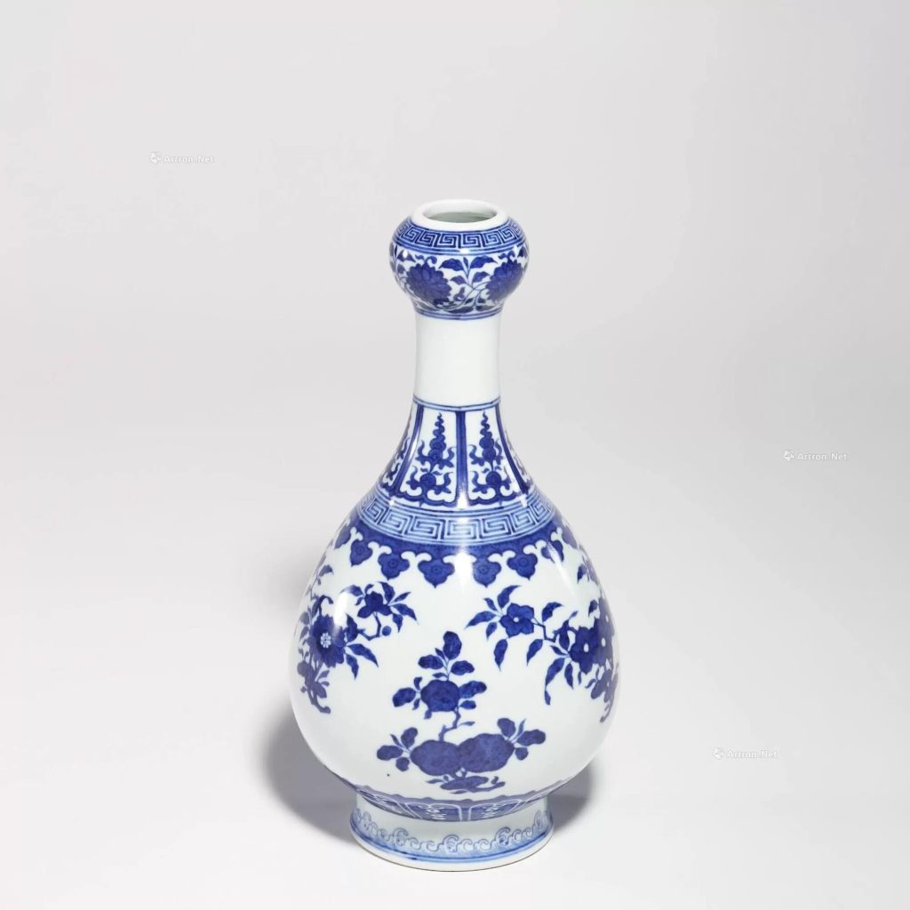 清乾隆青花花卉紋蒜頭瓶為清代官窯經典器型,造型源於秦漢青銅器蒜頭壺,經乾隆時期改良後定型為蒜頭小口、長頸束腰、碩腹圓鼓、圈足外撇的典型樣式。蒜頭口通常呈六瓣或八瓣瓜棱狀,頸部修長,腹部比例豐腴,整體線條流暢挺拔,既保留古銅器的莊重大氣,又融入清代宮廷的精緻審美。例如,西泠印社 2025 年拍出的青花折枝花果紋蒜頭瓶(高 27.7 厘米),其弧腹與束頸比例精準,圈足外撇增強穩定性,體現了乾隆官窯「仿古而不泥古」的特點。