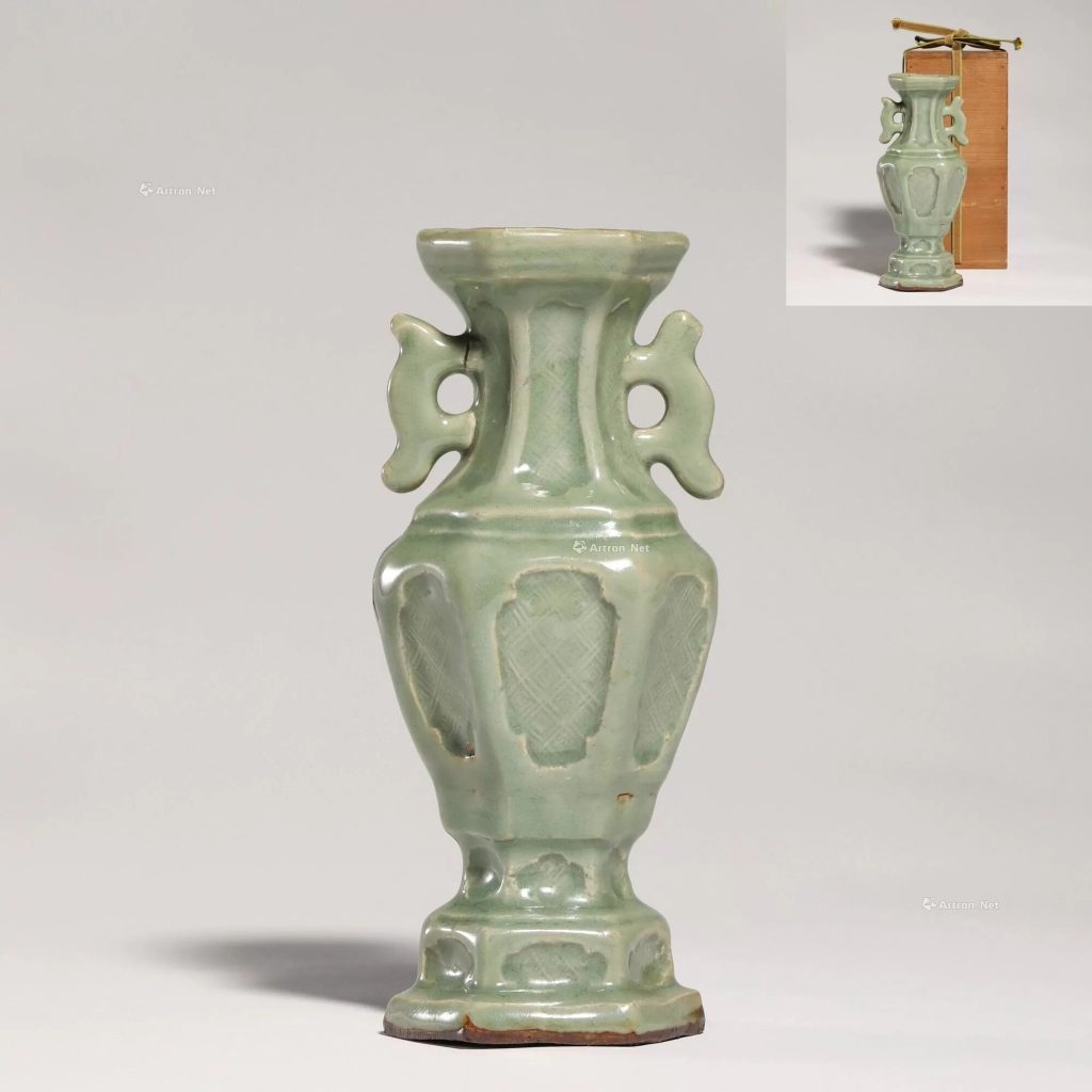 元代龍泉窯在繼承南宋工藝的基礎上,因應時代審美與外銷需求,發展出厚胎厚釉、裝飾繁縟的風格。此六方瓶以「六方」象徵六合(天地四方),寓意吉祥,是元代龍泉窯典型的大型陳設器。出戟耳源自商周青銅禮器,既增添莊重感,亦體現元代對傳統禮制的延續。目前考古發掘與博物館藏品中,尚未發現確鑿的元代龍泉窯出戟耳六方瓶實例,但可從同時期六方器與出戟耳器的特徵推斷其工藝與風格。