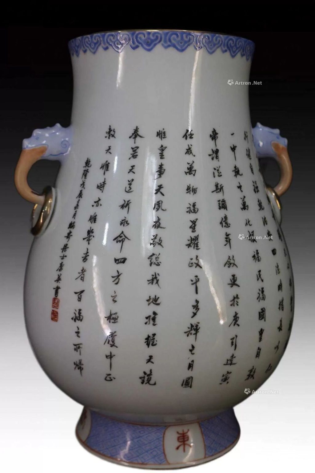 - 輔助紋飾:筒頸部飾粉彩纏枝蓮紋,寓意「富貴綿延」;近足處繪仰蓮瓣紋,層次分明,與主紋形成和諧對比。部分器物會在空白處題以墨彩詩句,如「天賜鴻福滿人間」,並鈐蓋胭脂水章「乾隆宸翰」,體現「詩書畫印」一體的文人審美風格。