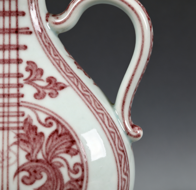 - 釉里紅工藝:釉里紅採用「釉下彩」工藝,先在瓷胎上以含銅的釉料繪製圖案,再施一層透明釉,而後入窯以高溫(約 1200-1300℃)還原焰燒制。因銅元素對窯火氣氛與溫度極為敏感,溫度過高易導致色澤燒失,過低則色澤發暗,故釉里紅瓷器燒成率低,向來被視為「瓷中珍品」。此件執壺的釉里紅色澤均勻飽滿,鮮而不艷,體現了明代釉里紅工藝的成熟水準。