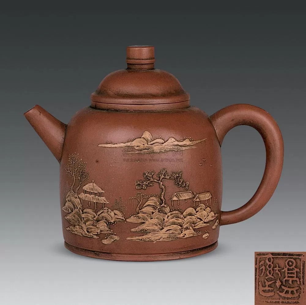 這是一件清代「景舟製陶」款堆繪山水紫砂壺,屬於宜興紫砂中的經典品類,融合了泥料、工藝與文人審美,是清代紫砂藝術的典型代表。