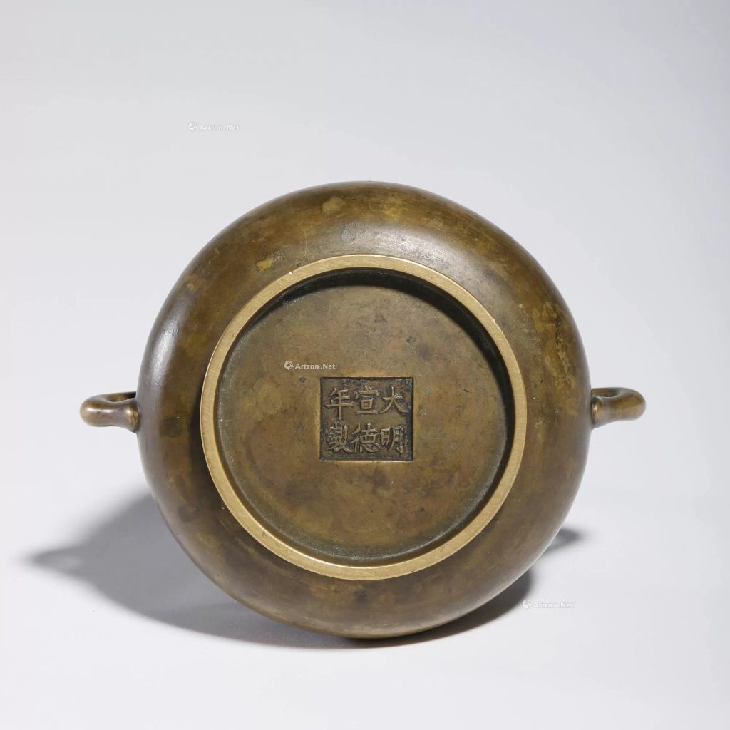 宣德銅耳香爐的基本形制為:敞口設計,口沿呈方唇或圓唇,爐頸矮而細,爐腹扁圓鼓起,底部設有三枚鈍錐形實足或分襠空足;爐口邊沿則配有橋形耳、獸形耳等多種式樣,常見的有象耳、獅耳、蚰龍耳等。其銘文年款多鑄於爐身外底,通常為「大明宣德年製」六字。此外,宣德銅耳香爐的色澤極為豐富,常見的有茄皮色、褐色、棗紅色、琥珀色、栗殼色等,每種色調皆渾然天成,體現出獨特的審美韻味。