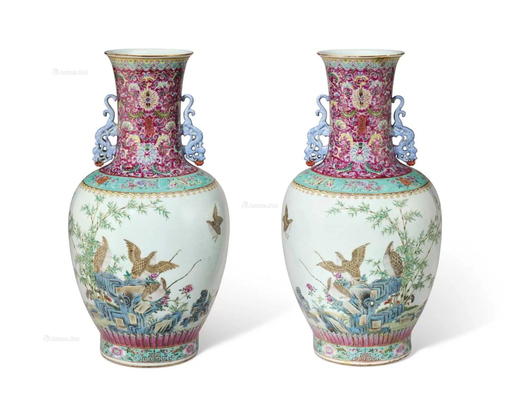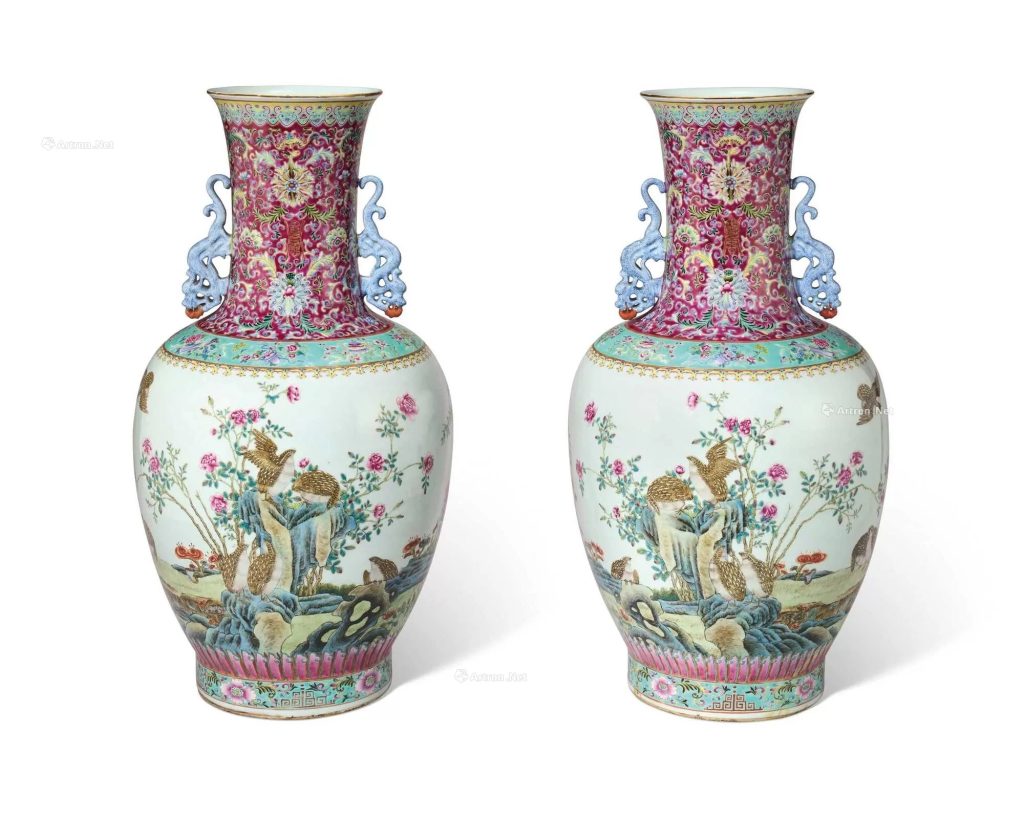 | 清乾隆 松石綠地粉彩安居圖如意耳瓶 | 香港蘇富比 | 2018 年春季拍賣 | 如意耳(非龍耳),繪鵪鶉、牡丹等安居圖紋飾 | HKD 7,000,000 – 9,000,000 | HKD 17,520,000 |