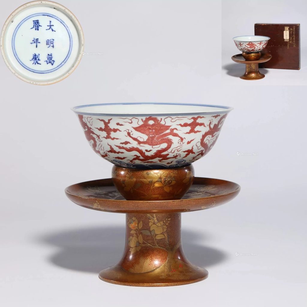「明萬曆 青花海水礬紅團龍紋大碗」與「江戶蒔繪高足碗托」的組合,是跨越中日兩國、融合明代宮廷瓷藝與日本江戶時期工藝的獨特收藏品,前者體現明代萬曆年間禦窯瓷器的典型風格,後者展現日本傳統蒔繪工藝的精華,二者搭配既具實用性,又蘊含跨文化交流的獨特意義。以下從詳細介紹與拍賣成交紀錄兩方面展開說明: