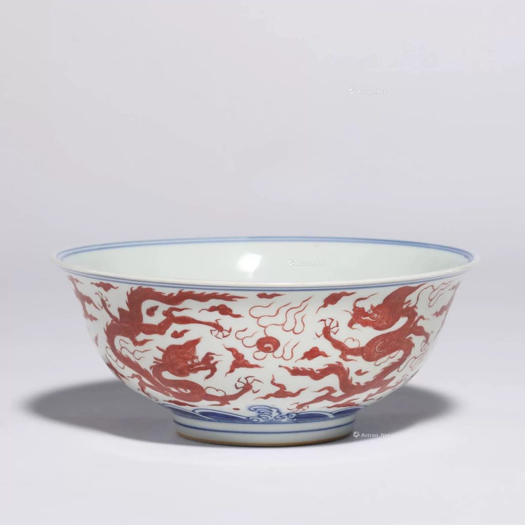 - 礬紅繪製團龍紋:浪頭之上以礬紅料(以氧化鐵為著色劑的低溫紅釉,色澤鮮艷濃郁)繪製團龍,龍身盤曲成團,形態飽滿,須髯飄揚,鱗片、爪牙刻画細入微,五爪張揚銳利(皇家器物常用五爪龍,象征皇權至尊);碗外壁共繪五條團龍,或正面張口,或側身騰躍,氣勢磅礴,與海水紋相互映襯,暗含「龍馭四海」的吉祥寓意。