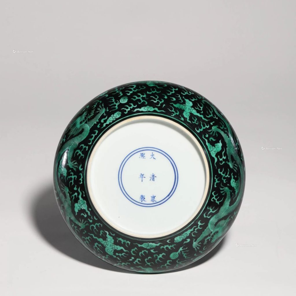 典型康熙墨地綠釉龍紋盤多為「敞口、弧壁、淺腹、圈足」的標準盤式,尺寸多在直徑 20-25 厘米之間,器型規整端莊,修胎工整,圈足打磨光滑,足底常落「大清康熙年製」六字雙行楷書款(官窯器物),字體端正,筆畫勻稱,為辨識年代與等級的重要依據。