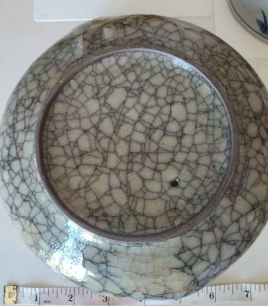 - 胎釉結合:胎土含鐵量高,呈紫黑色(「紫口鐵足」是哥窯鑑定要點之一,這件器物的口沿和足底若經打磨,可看到胎色);釉料配方特殊,高溫燒製後胎釉收縮率不同,形成自然開片。