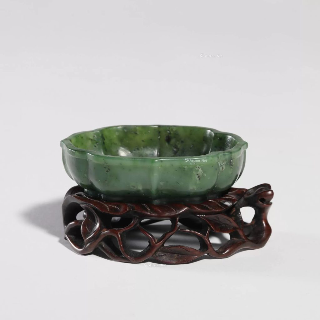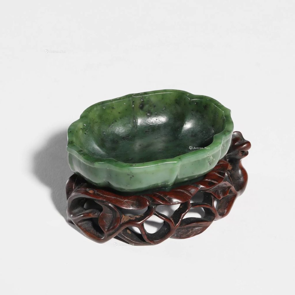 碧玉花口水洗是清代文房雅器的典型代表,以花口造型為核心特徵,常見海棠式、菊花式、荷葉式等形制,兼具實用性與藝術性。其材質多採用新疆和田碧玉或瑪納斯碧玉,質地溫潤細膩,色澤深沉翠綠,局部可見自然形成的黑色斑點或紋理,彰顯古樸之美。