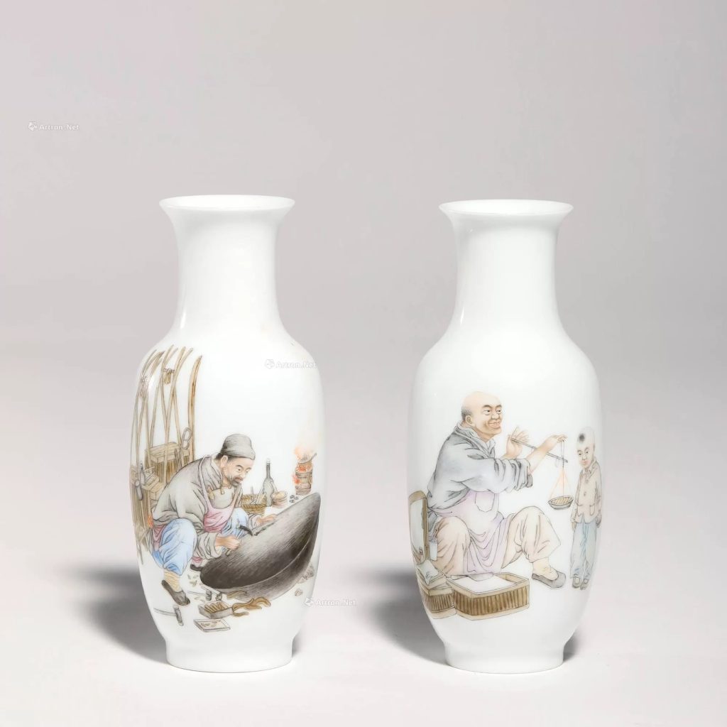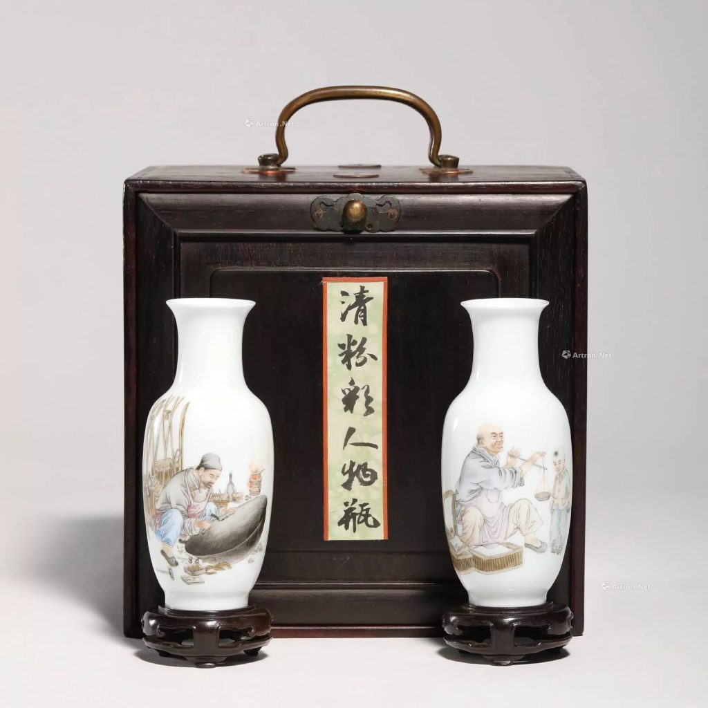 - 打底與暈染:人物肌膚、衣紋以玻璃白打底,而後用軟筆蘸顏料輕輕暈染,使色彩由深至淺過渡自然(官窯暈染更細密,民窯略粗放)。兩瓶暈染力度需一致,避免一側深一側淺。