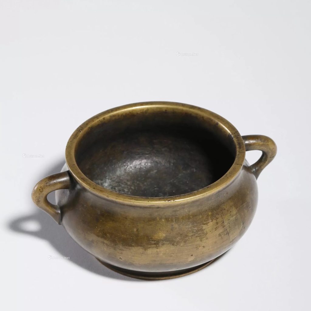 - 拍品簡介:高 7.2 厘米,口徑 11.5 厘米,重 1207 克,敞口、束頸、扁鼓腹,雙耳直立,三乳足穩健,底款「大明宣德年制」鑄款清晰。皮色呈栗殼色,包漿醇厚,器型完美對稱,傳承有序,曾為歐洲老藏家舊藏。